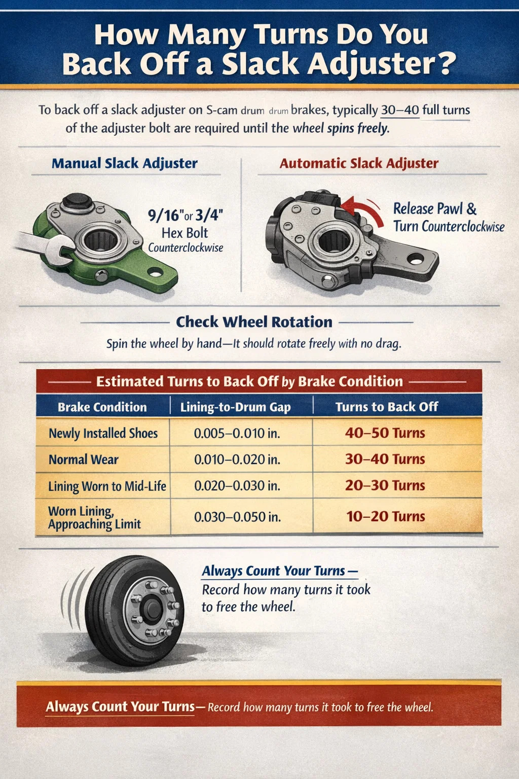 На практике большинство технических специалистов сообщают об 25–40 оборотах за хорошо отрегулированный тормоз в нормальном состоянии. Тормозу, который уже был на грани регулировки (с изношенными накладками или чрезмерным зазором), может потребоваться всего 10–15 оборотов. Только что замененному комплекту колодок с максимальной толщиной подкладки может потребоваться 45 или более оборотов, чтобы полностью втянуться.