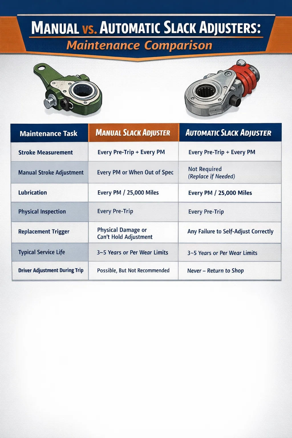 The table below summarizes the key maintenance differences between manual and automatic slack adjusters to help fleet managers and owner-operators build the right PM schedule.